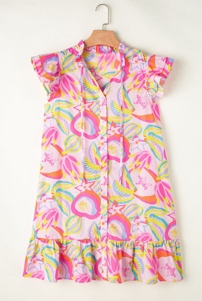 Get ready to look fresh and fruity in our Fruitful Floral Dress! With flutter sleeves and a tie front v-neck, this dress will make you feel flirty and cute. Plus, the ruffles and bright print add a playful touch to this must-have piece. Perfect for any occasion!