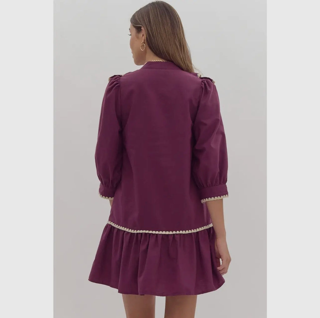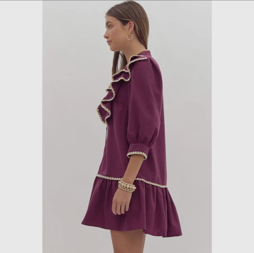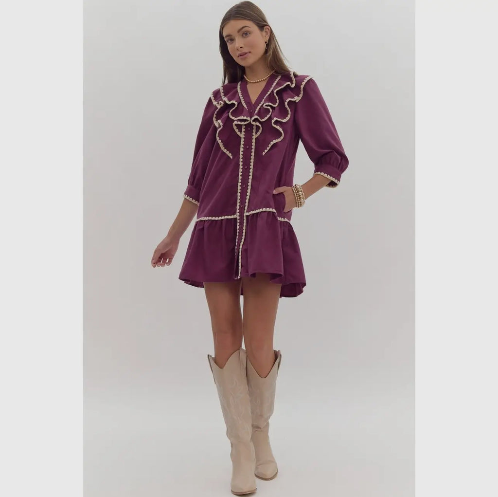 The Ruffled Rory Dress in Plum is a must-have for any fashion-forward individual! This solid button up mini dress features contrasting stitch detail and pockets at the side for added functionality. Its lightweight and non-sheer fabric makes it perfect for any season, while the ruffled design adds a touch of playfulness to your look. Upgrade your wardrobe with this versatile and stylish dress today!