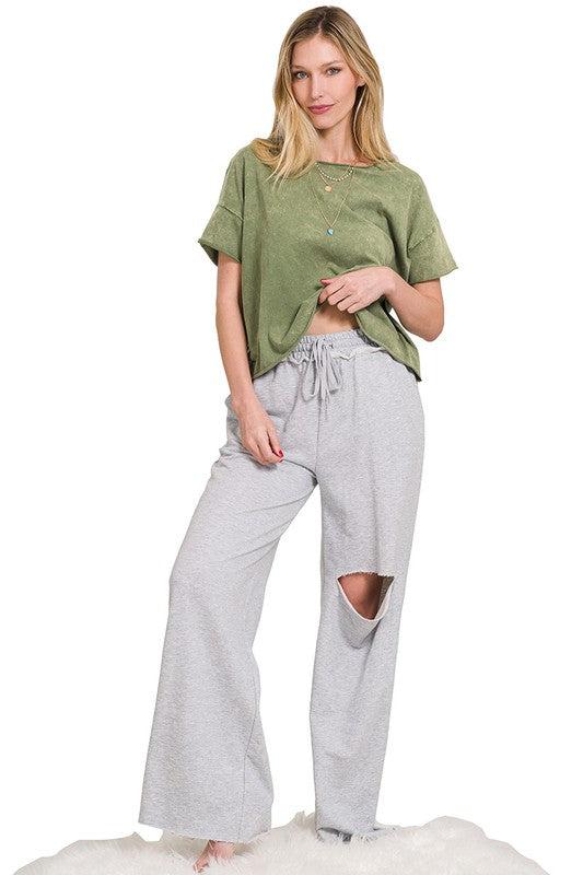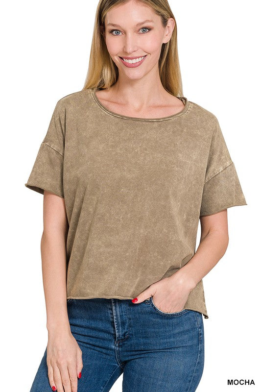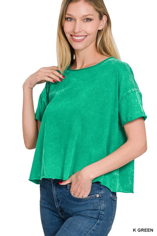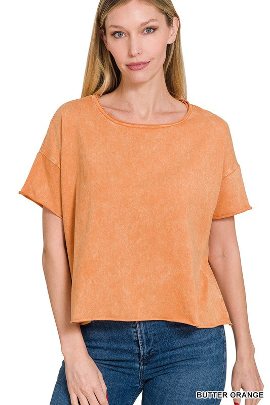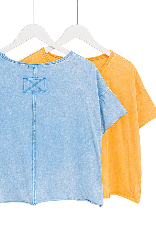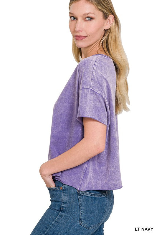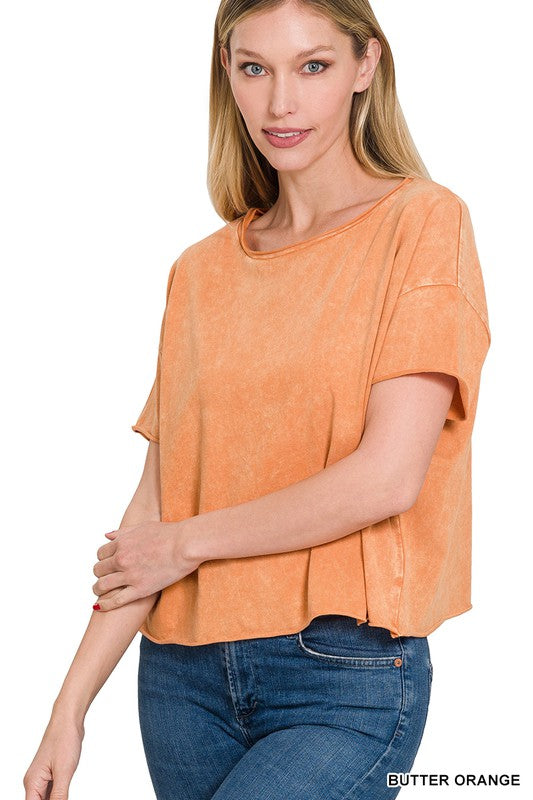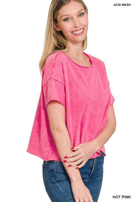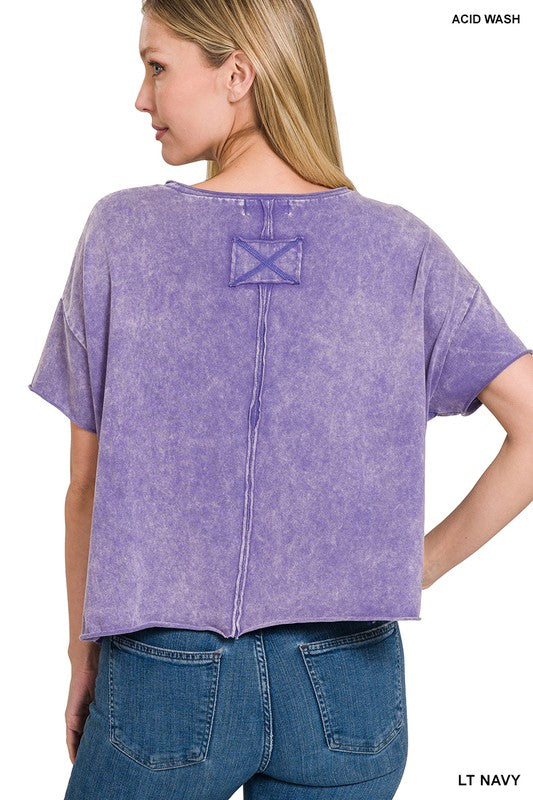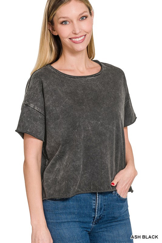 The Acid Wash Raw Edge Short Sleeve Crop Top is a must-have for those seeking a trendy and edgy look. Its acid wash finish gives it a unique and vintage-inspired appearance, while the raw edge details add an element of rugged style. This short sleeve crop top is a versatile piece that can be paired with high-waisted jeans or skirts to create a fashionable ensemble suitable for casual outings or music festivals.