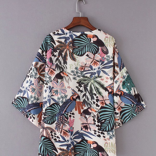 Easy-going style open blouse with tropical print. Wear it over a tank top in any of the print colors.