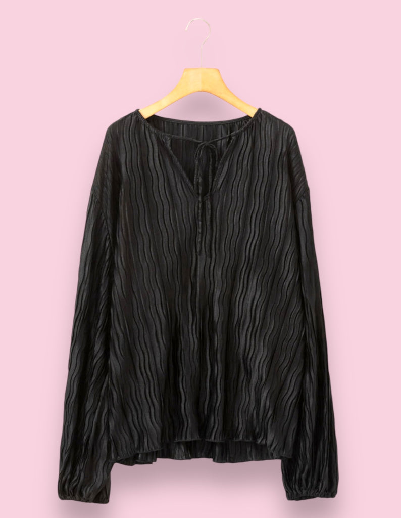 Elevate your wardrobe with our Black & Bold Blouse! The textured fabric and bubble sleeves add a touch of sophistication, while the v neck with tie adds a playful touch. Make a statement and stand out in style with this must-have piece.