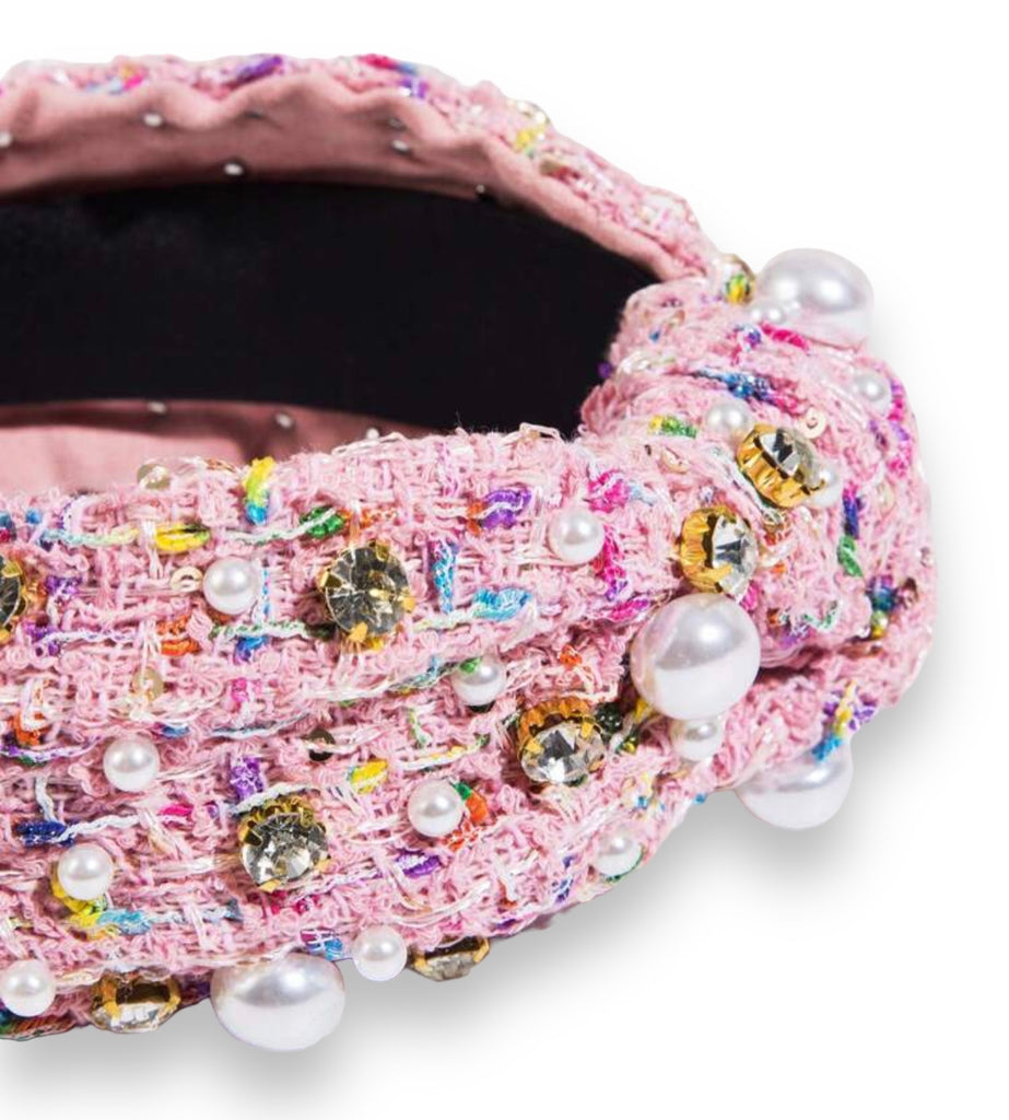 Pink tweed knotted headband with multi colored threads and accents of pearls and rhinestones.