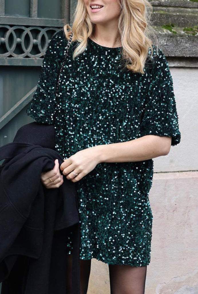 Fully sequenced dark green boxy fit dress