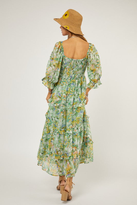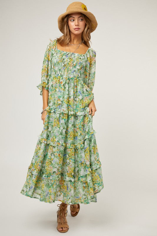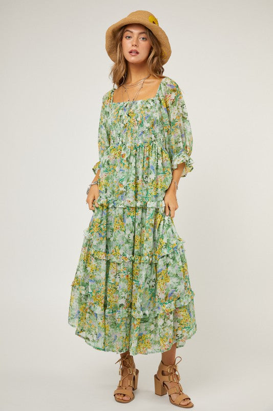 Embrace a sense of timeless beauty with the smocking body ruffle detail floral chiffon midi dress. Its smocked bodice offers a flattering fit while the ruffle details add a touch of grace to the design. this midi dress strikes the perfect balance between elegance and comfort, making it a versatile choice for various occasions.