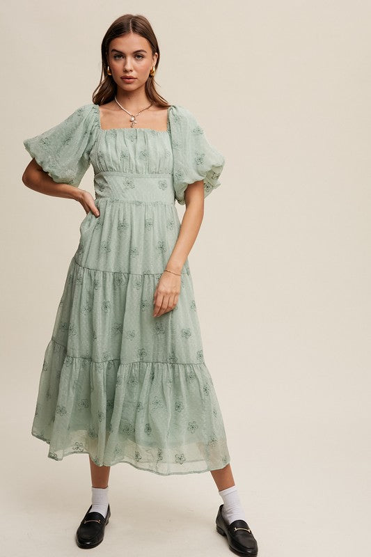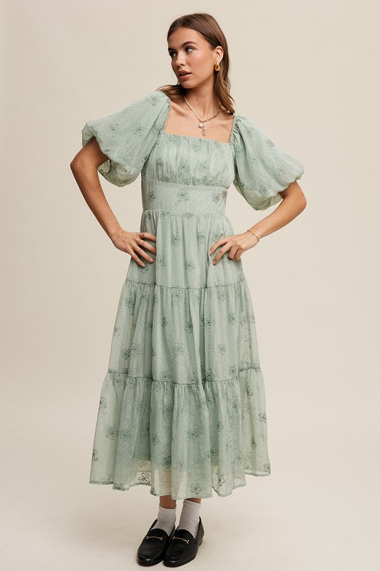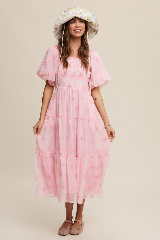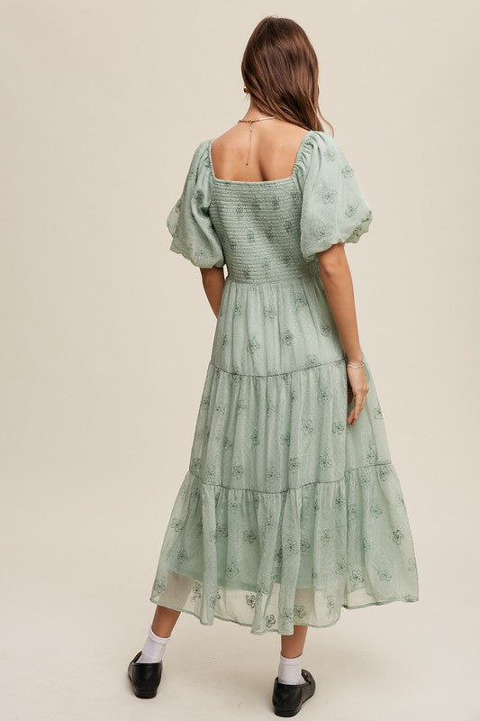 Introducing our Flower Embroidered Puff Sleeve Tiered Maxi Dress, a delightful blend of romance and elegance. Crafted from airy mesh fabric, this dress exudes ethereal charm. The square neckline with elastic detailing adds a touch of femininity, while the pleated detail on the front top enhances its visual appeal. The puff sleeves with elastic cuffs create a whimsical silhouette, complemented by the smocking on the back for a flattering fit. The tiered skirt adds movement and dimension, and hidden side seam pockets offer functionality.