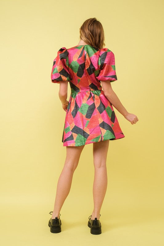 Rich colours and art deco undertones encapsulates this collection. The mini dress is crafted in a printed metallic fabric that is cut to be fitted at the bodice with an flare A-line skirt. It has voluminous puff sleeves with diamante bows at the centre front and a zip fastening at back. Dress is lined and fits true to size.