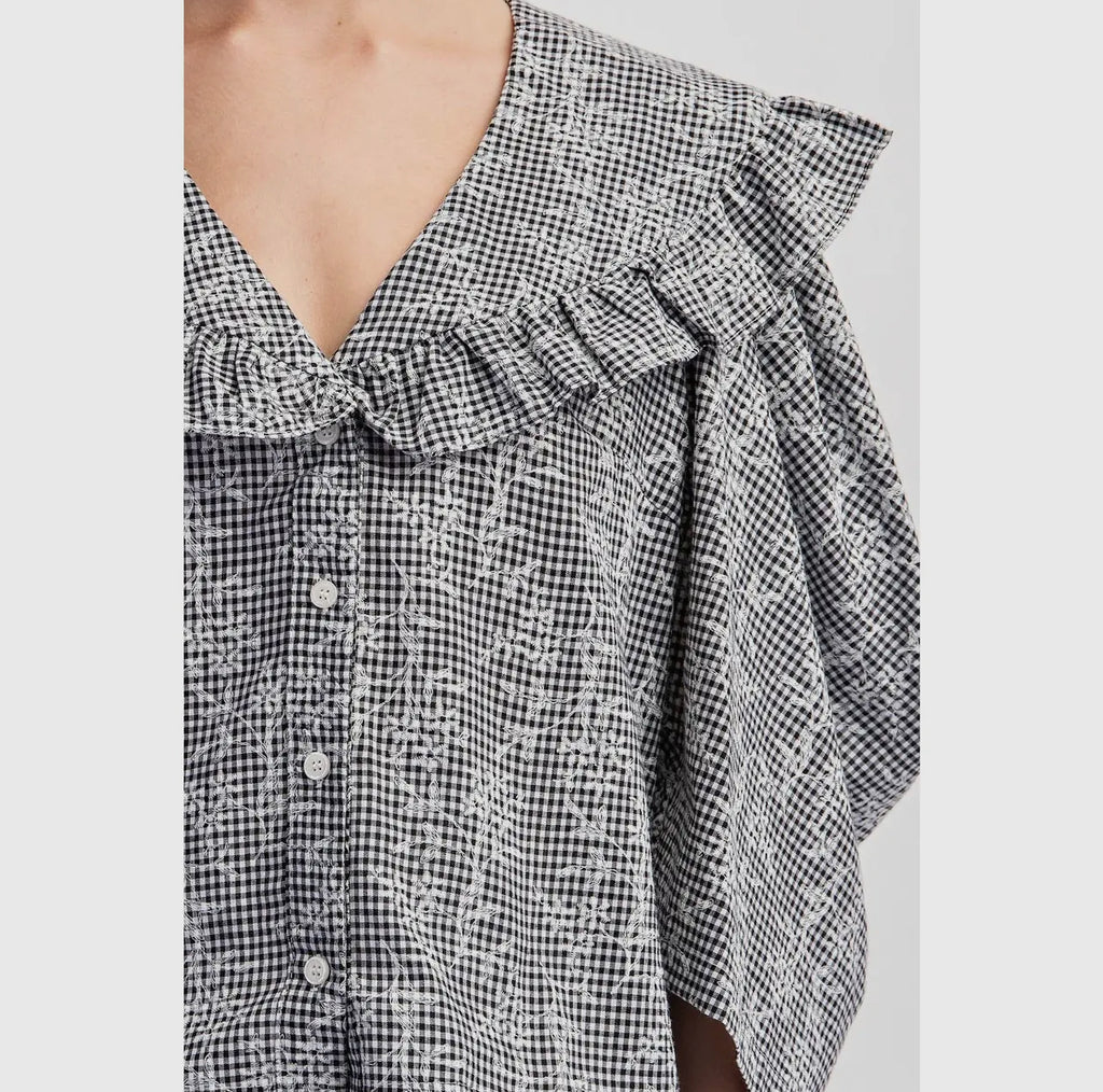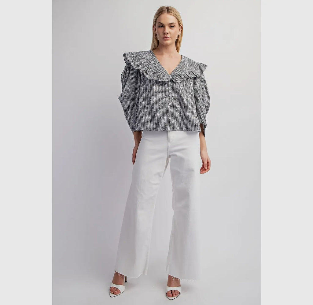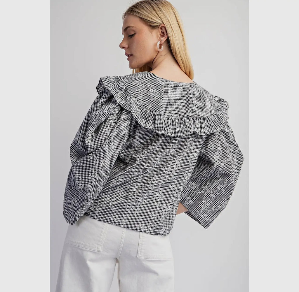 Get ready for some fun with the Hay Rides Blouse! This black and white gingham top features playful embroidered floral details. Perfect for any outing, this blouse will add a touch of whimsy to your wardrobe. Hop on and ride in style!