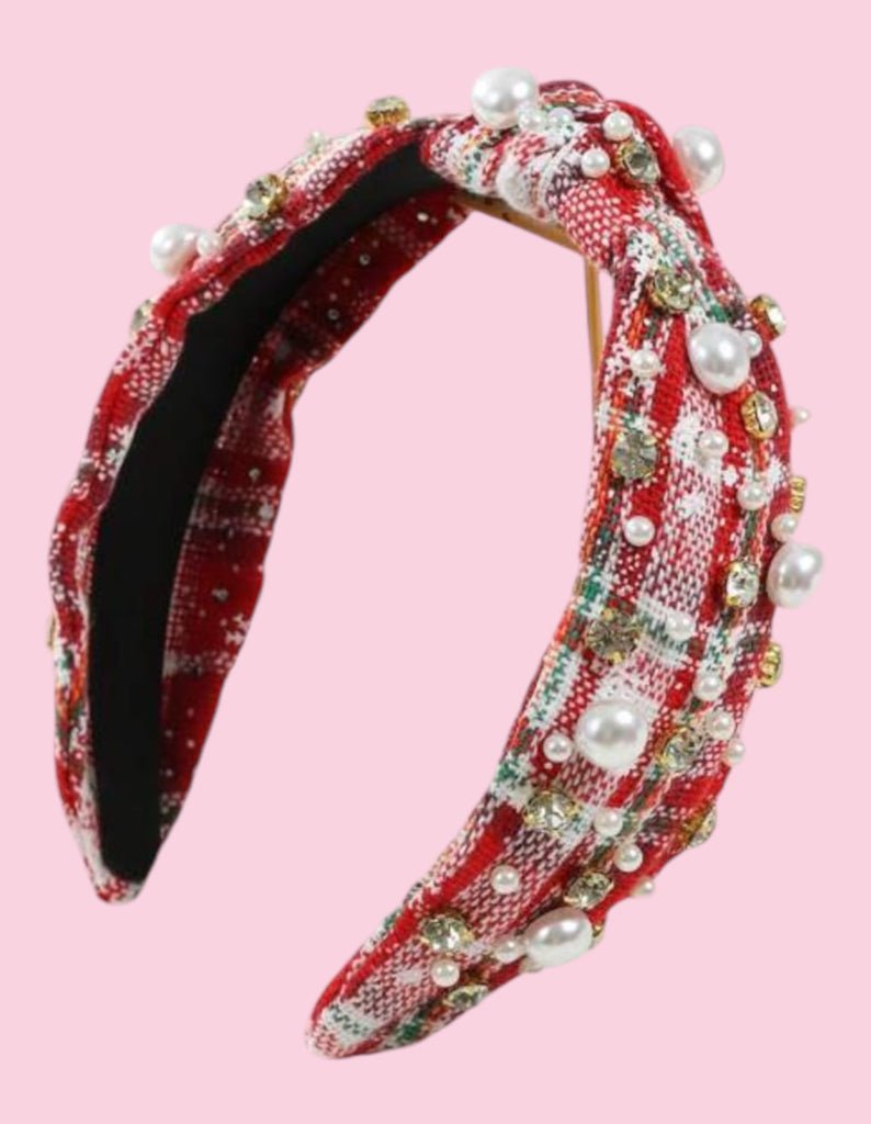Spread the holiday cheer with our festive headband! Featuring a classic plaid design and adorned with elegant pearls and stones, this headband is perfect for adding a touch of joy and style to any outfit. The unique knotted detail adds a charming twist to this must-have accessory. Get yours now and spread some holiday cheer!