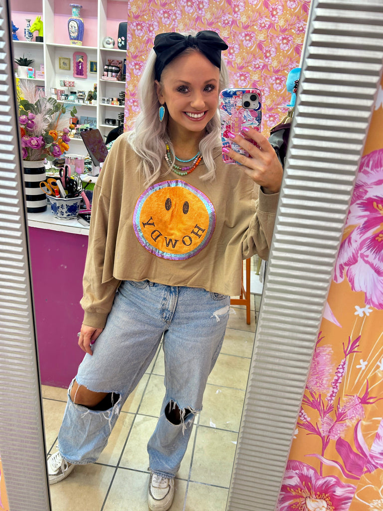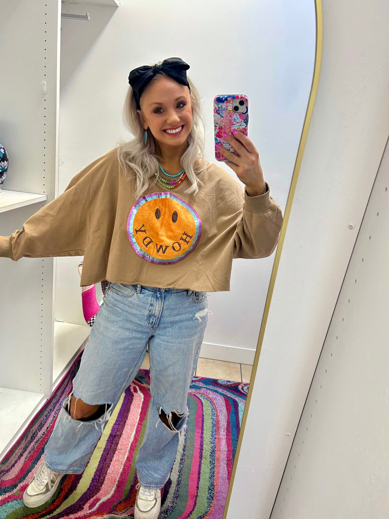 Howdy, cutie! This crop sweatshirt is sure to turn heads with its blinged smiley face design. The taupe color adds a touch of elegance to the oversized fit. Stay cozy and stylish in this Howdy Crop Sweatshirt.