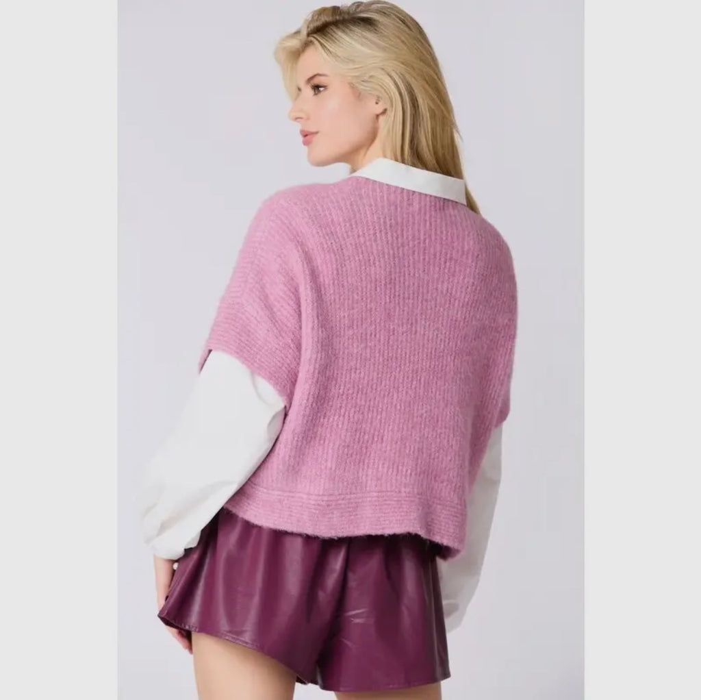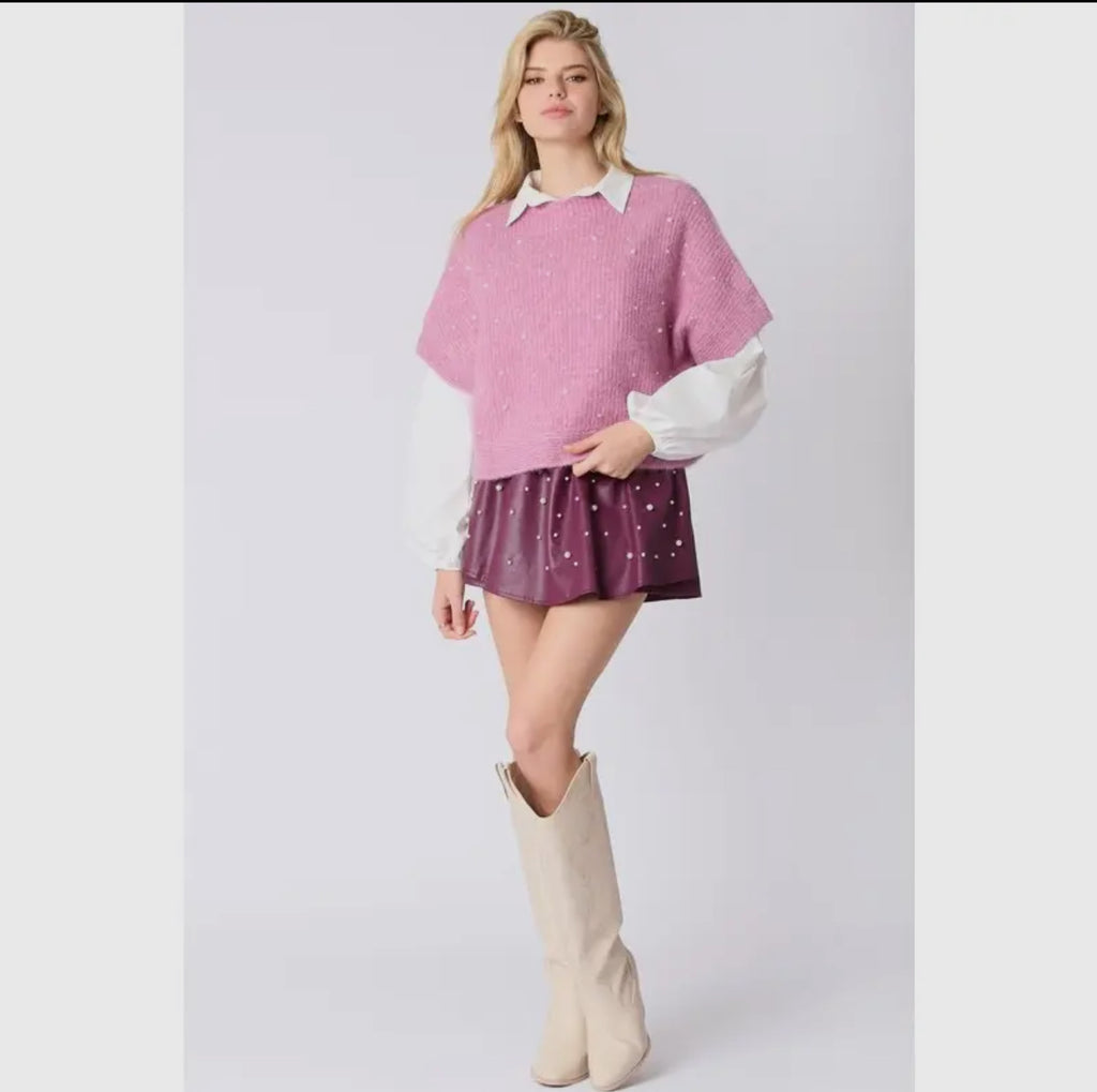 Stay cute and cozy in our Lotus Sweater! This unique piece features delicate pearl embellishments and a chic cropped, square cut. The color is a beautiful blend of mauve and lilac, perfect for adding some playfulness to your wardrobe.