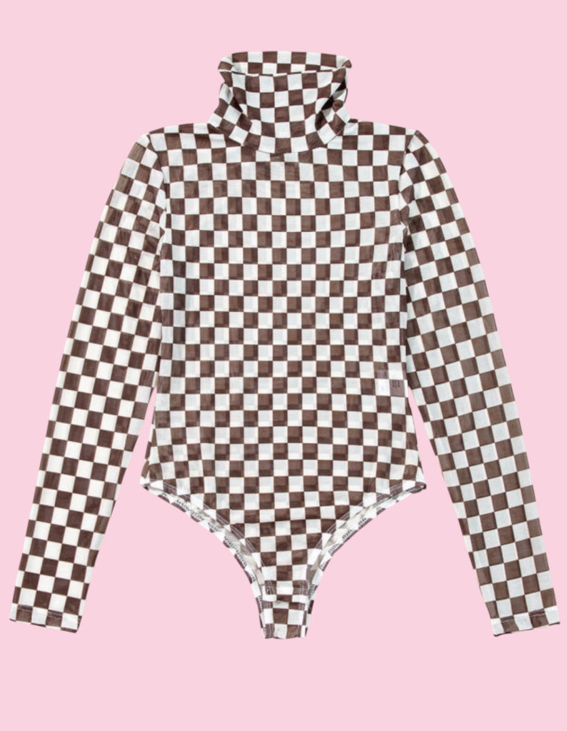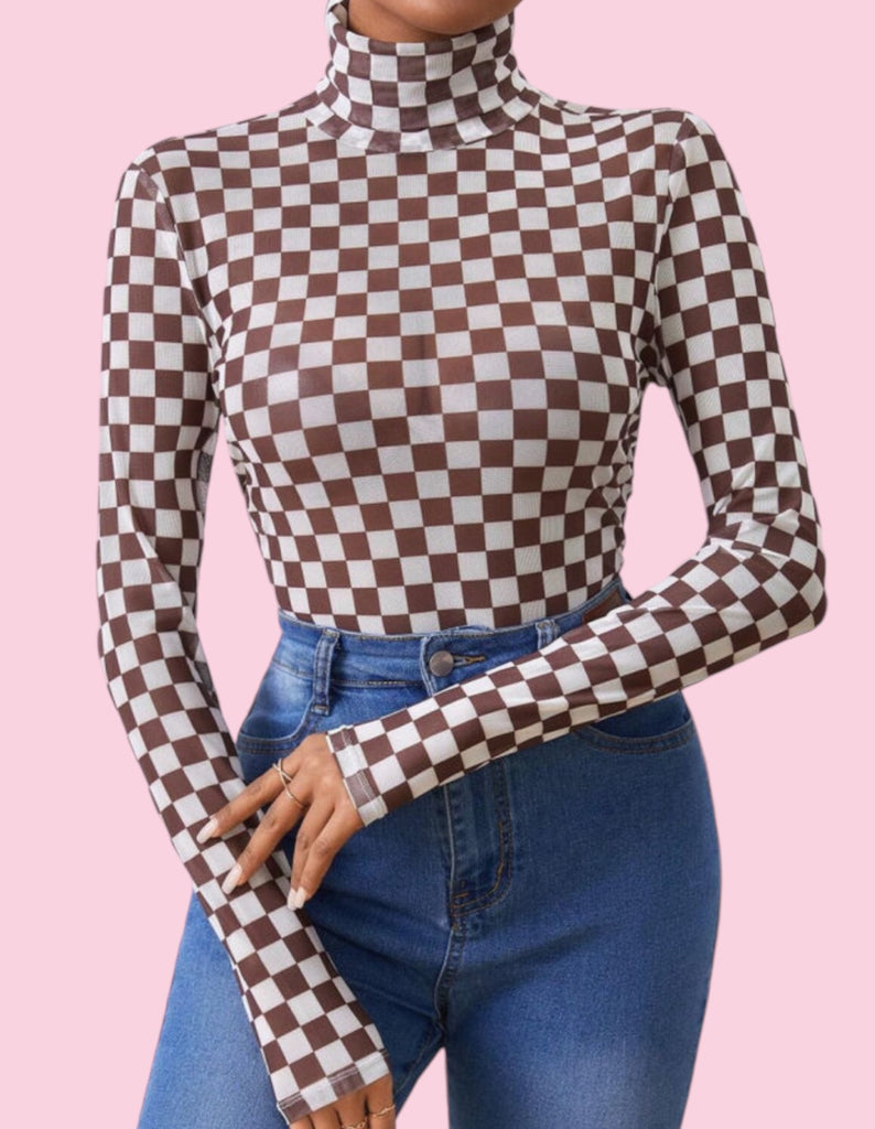 Fall in love with our Mocha Checkered Bodysuit! Its breathable mesh and long sleeve design make it perfect for layering and staying comfortable all day. Versatile and stylish, it will become a staple in your wardrobe.