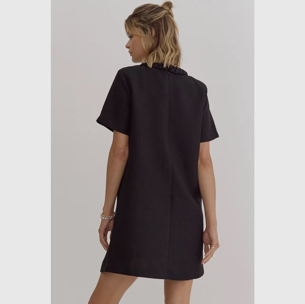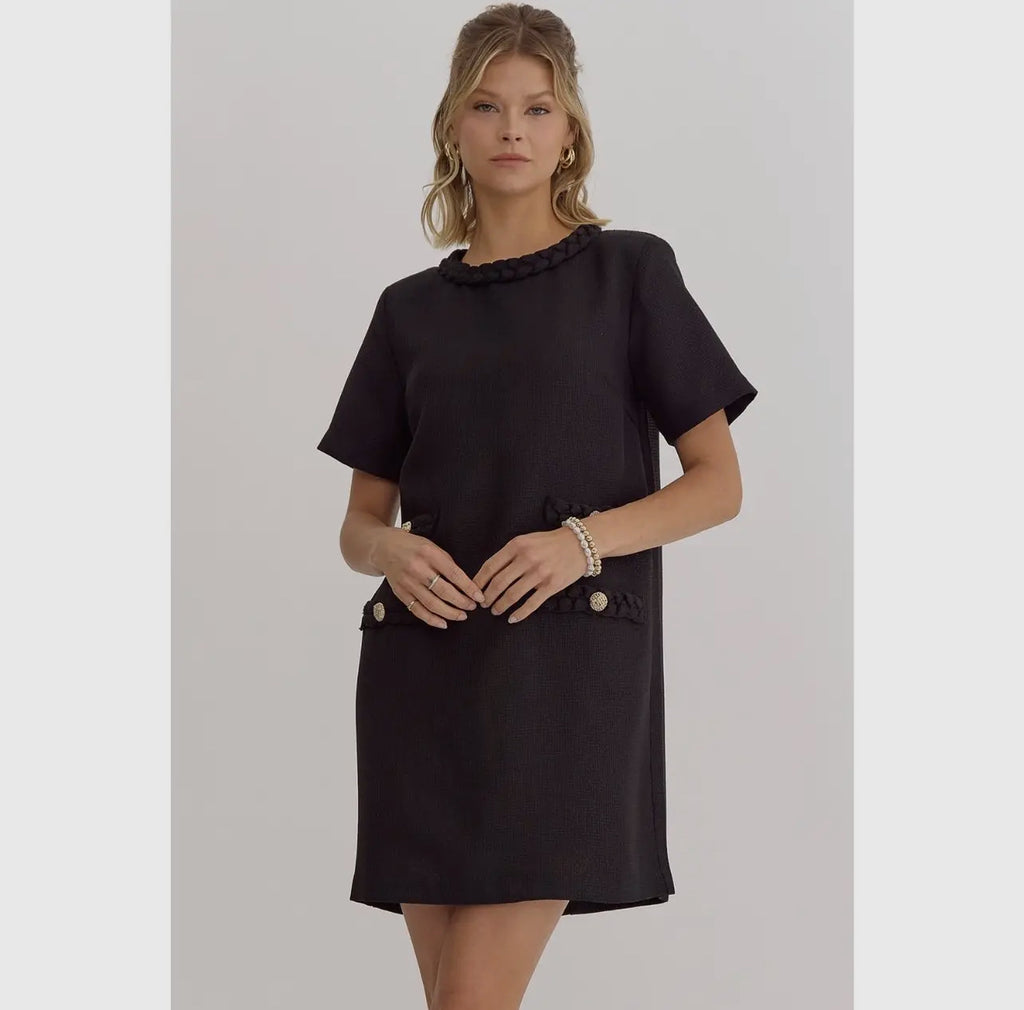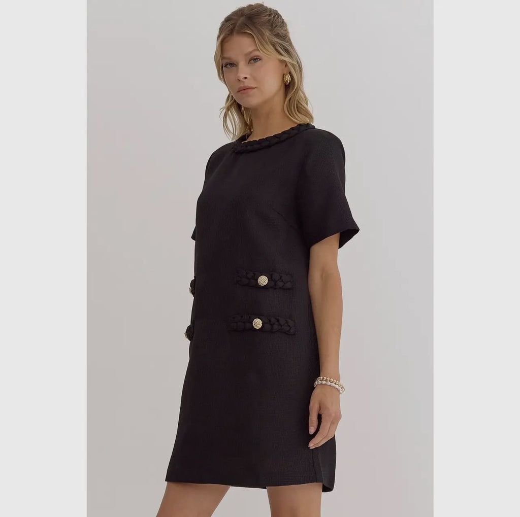 Elevate your style with My Go To Tweed Dress featuring gold button accents, a braided round neckline, and a convenient zipper back. This dress is perfect for any occasion and will have you looking effortlessly chic. Dare to be different with this must-have addition to your wardrobe!