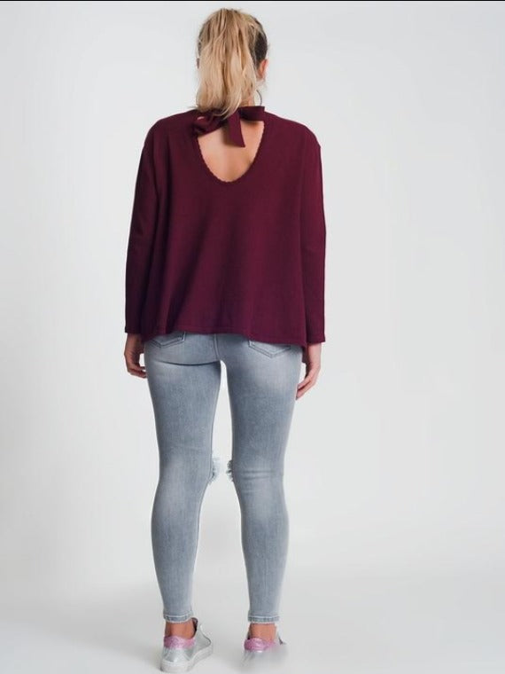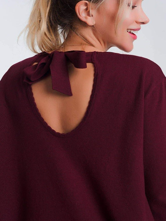 Maroon sweater with adorable tie back! V-neck, can be worn off the shoulder, made of soft and lightweight fabric.