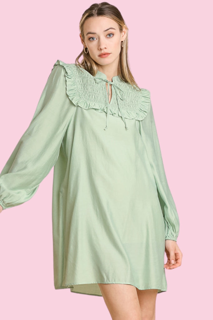 Unleash your inner fashionista with our Pistachios Please Dress! This stunning long sleeve dress features a beautiful pistachio green color that will make you stand out from the crowd. The smocked ruffle yoke and tie detail add a touch of femininity and elegance to any outfit. Elevate your wardrobe with this must-have piece!