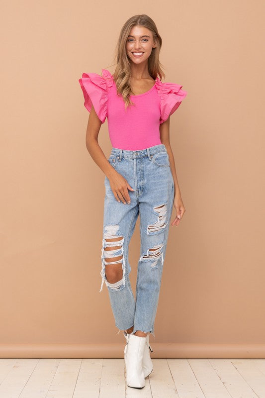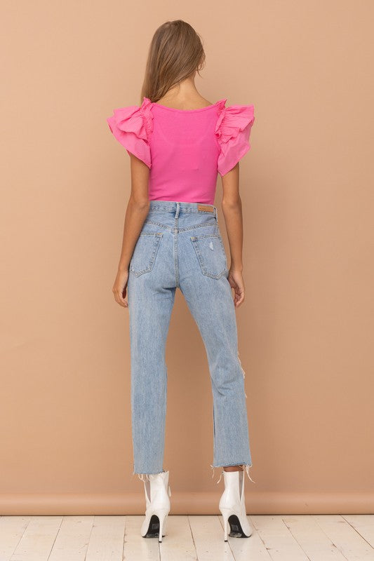 This bodysuit features soft jersey rib fabric that offers excellent stretch, ensuring a flattering fit for all body types. Crafted with the finest materials to bring you comfort and style like never before. The standout feature of this bodysuit is the exquisite poplin cotton shoulder puff adorned with delicate ruffles.