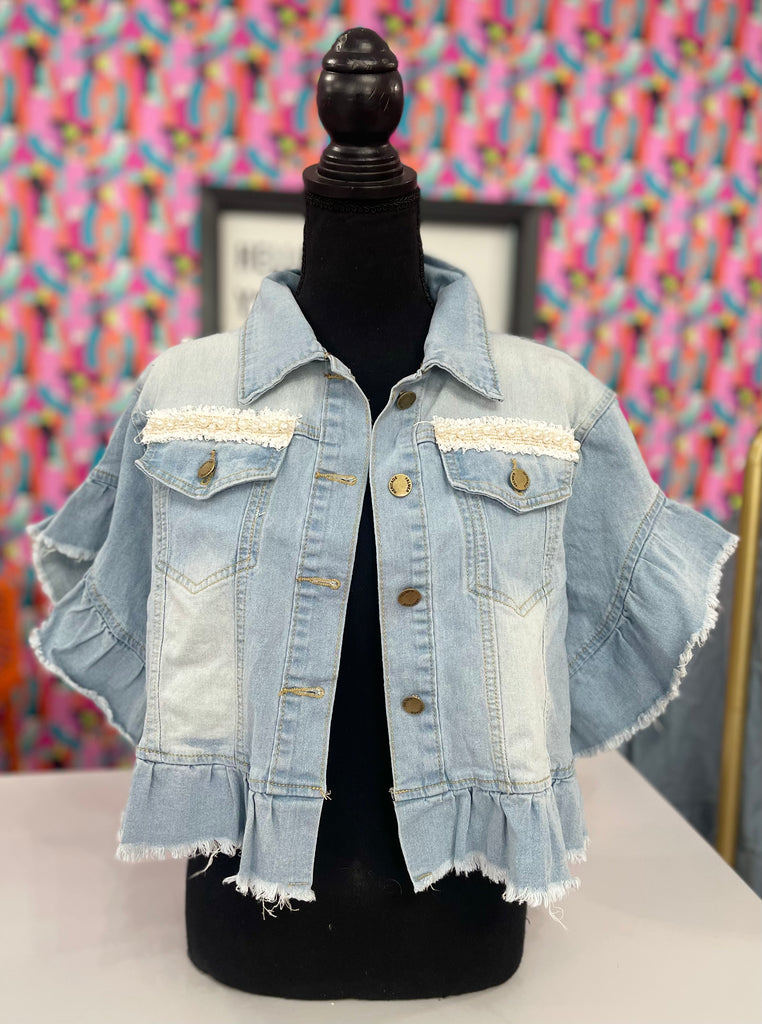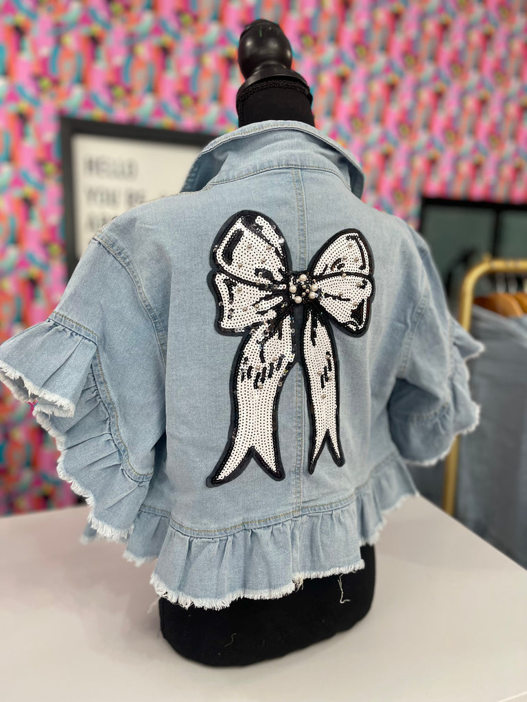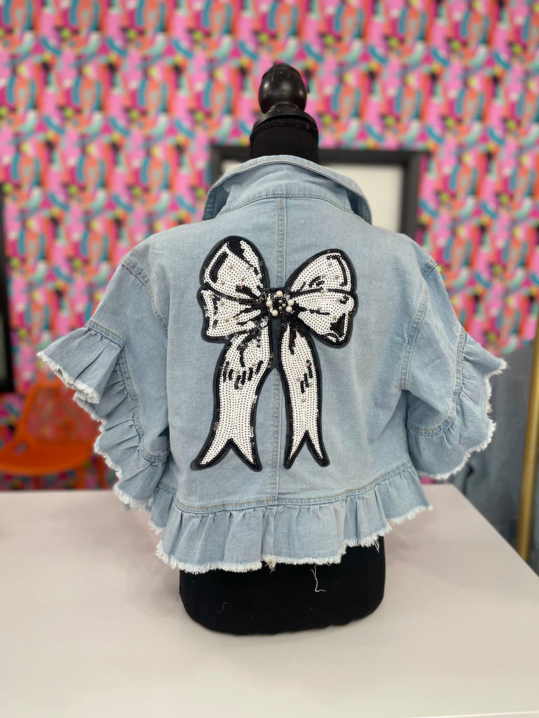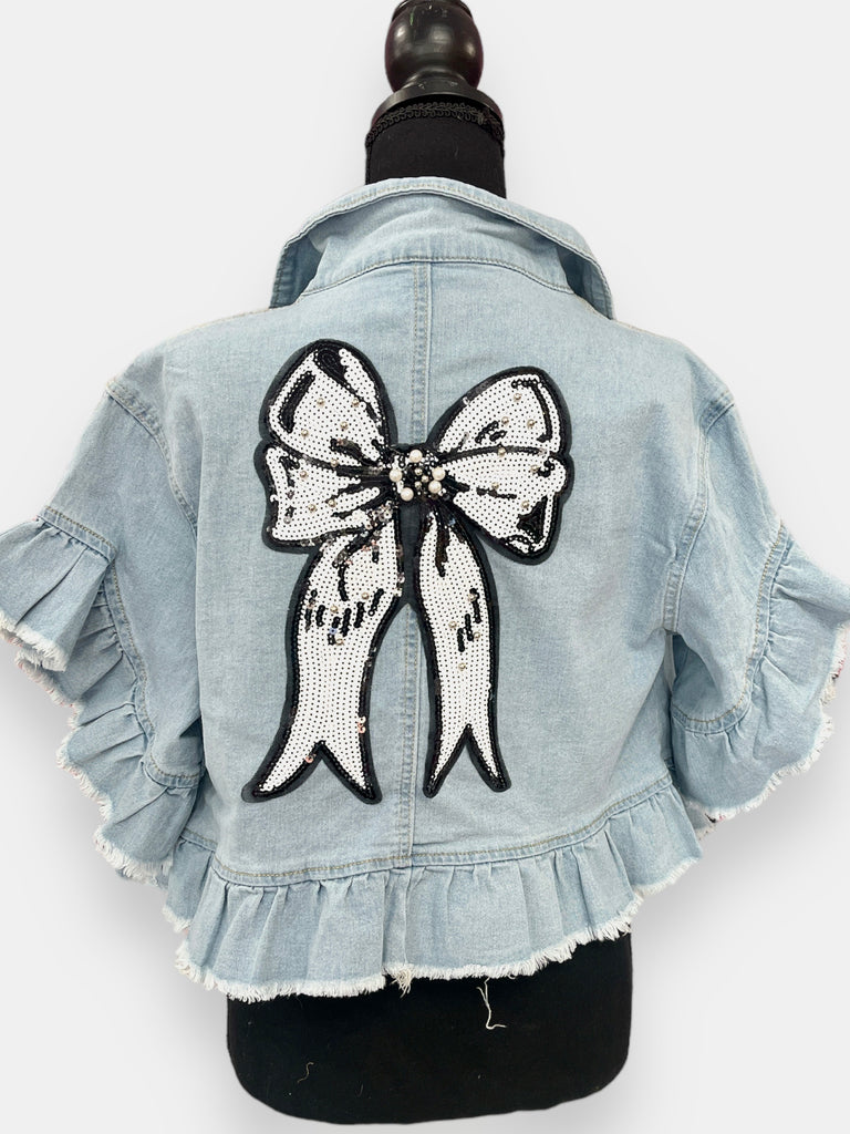 Custom short sleeve denim jacket with ruffles. Black and white sequence bow accent on the back and pearl trim on the front pockets.