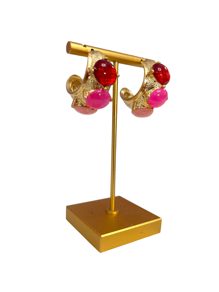 Gold hoop with pink gems. Hypoallergenic, titanium post, brass hook.