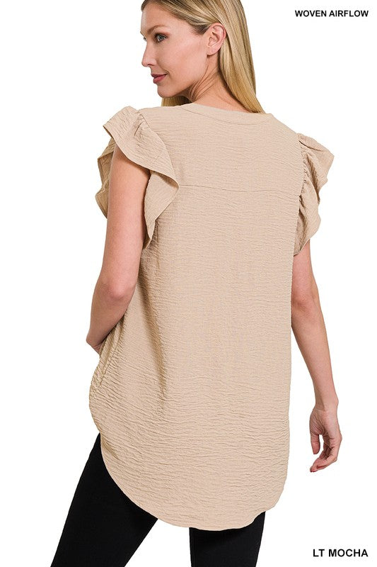 The Woven Airflow Ruffled Sleeve High-Low Top is a fashionable and airy addition to your wardrobe. Crafted from breathable woven fabric, this top features ruffled sleeves that add a touch of femininity and style. The high-low hemline gives it a trendy and contemporary look.